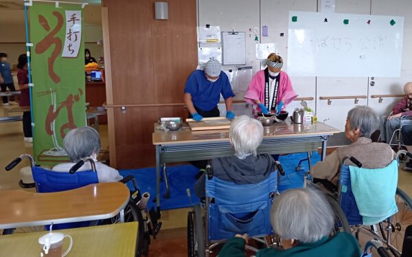 入所者様の前で蕎麦のたねを作り、切って蕎麦の麺を作る実演を行っていただきました。