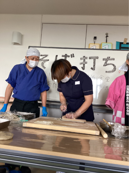 作って頂いたたねを延ばした後、蕎麦を切る工程に入ります。刃物を使用するため入所者の皆様に応援していただきながら職員が挑戦しました。
