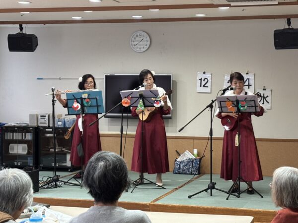 そして12月24日には、入所の方のクリスマス会を開催しました。こちらには”ウクレレユニット奏 KANADE”さん(3人組)にお越しいただき、優しく心地よいウクレレの音色を届けてくださいました。クリスマスにぴったりの選曲で、皆様穏やかな表情で演奏に聞き入っておられました。