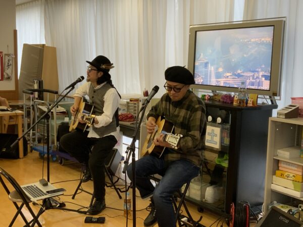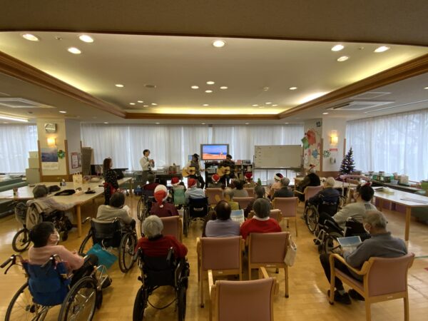 12月20日には、デイケアのクリスマス会を実施しました。この日は、男性二人組の”ハツコイ”さんにお越しいただき、50~80年代の懐かしい名曲や、クリスマスソングをたくさん披露していただきました。利用者様からは自然と手拍子や歌声が上がり、会場はとても和やかな雰囲気に。途中には職員とのコラボ演奏もあり大いに盛り上がりました。