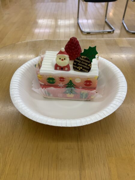 楽しみのおやつには、イチゴのクリスマスケーキが登場「甘くて美味しいね」「クリスマスらしくていいね」と、笑顔あふれるひとときとなりました。