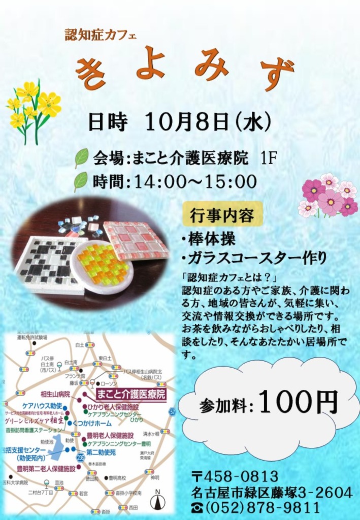 認知症カフェ「きよみず」10月のご案内 2025.07.29 いつもお世話になっております。 10月8日(水) 14:00~15:00 まこと介護医療院1階にて認知症カフェを開催いたします。 詳細は⇩をご覧ください! まこと喫茶 《R7.6.18》 前の記事 感染症対策についての注意喚起 次の記事